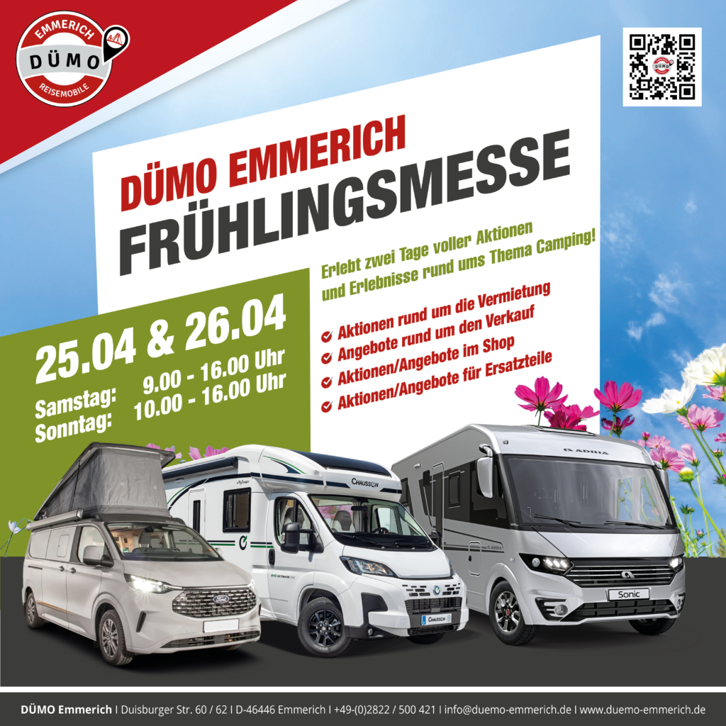 Bei Dümo Emmerich an der Duisburger Straße 60/62 erwartet Sie eine große Auswahl moderner Reisemobile und Wohnmobile für Ihren nächsten Urlaub.