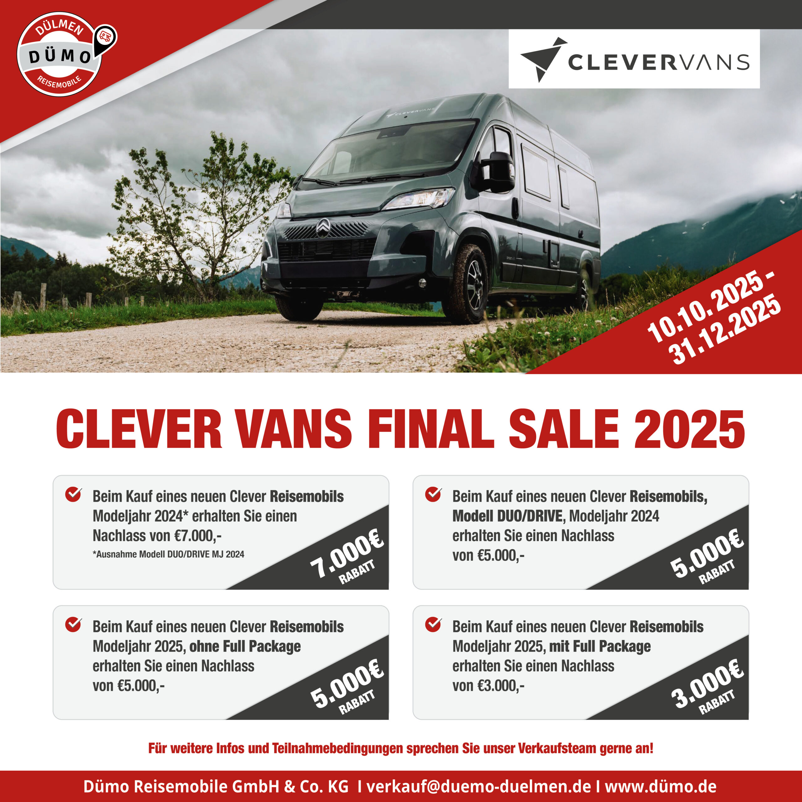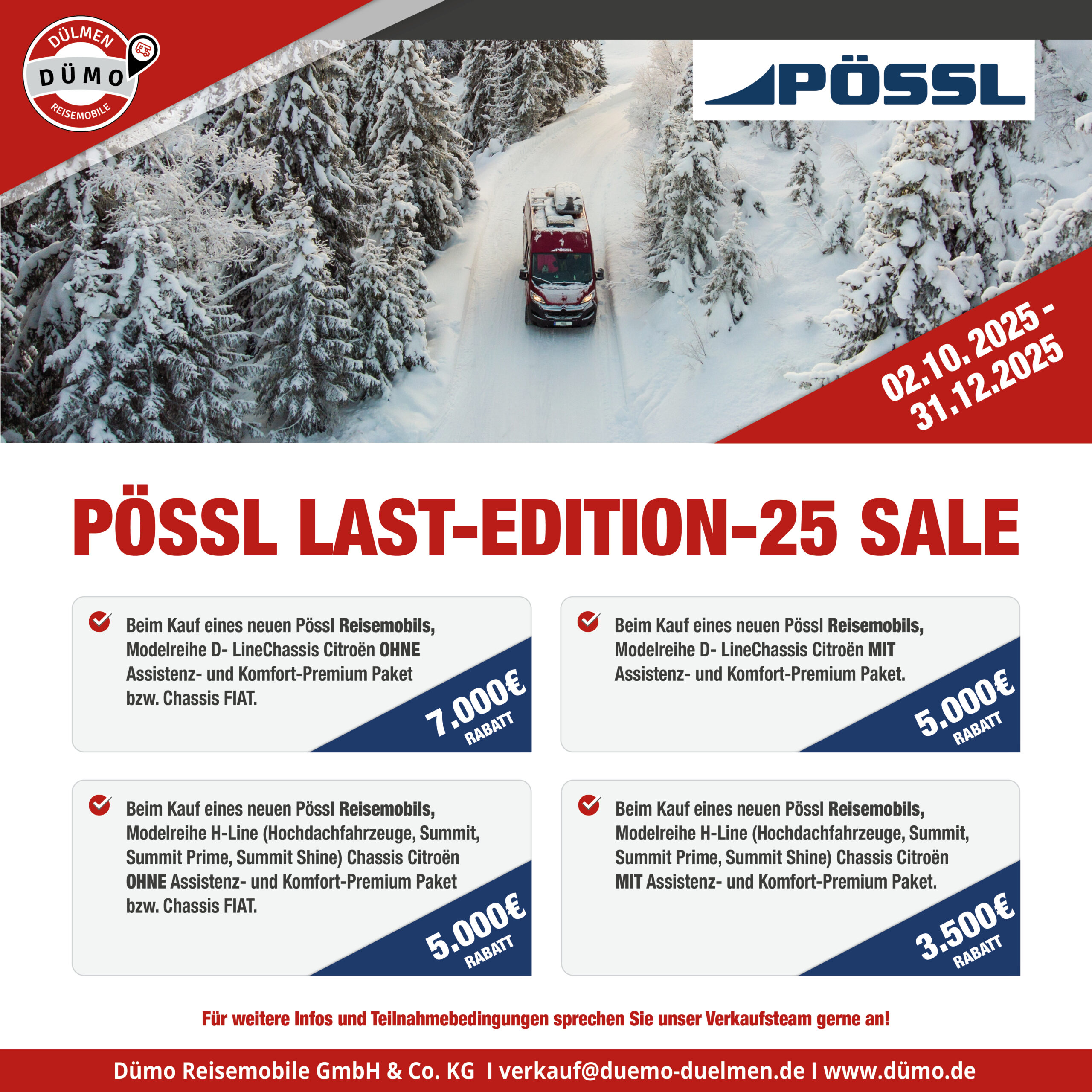 Sichern Sie sich jetzt eines unserer Reisemobile, Kastenwagen und Wohnwagen aus dem DÜMO-Mietwagen-Abverkauf zu unwiderstehlichen Preisen. Von sofort verfügbar bis zum Sparpreis: perfekt für alle, die sich jetzt für die neue Saison rüsten möchten. Schauen Sie vorbei, vergleichen Sie in Ruhe und lassen Sie sich freundlich und kompetent beraten — viele Modelle sind nur einmalig verfügbar.