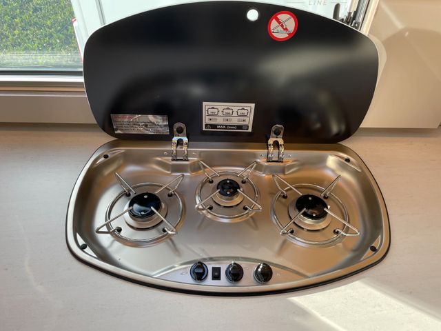 Beide verfügbaren Grundrisse des Lyseo Gallery TD sind mit einer offenen Küchenzeile samt großem Kochfeld ausgestattet. Je nach Variante wartet zusätzlich ein 142 oder 175 Liter umfassender Kompressor-Kühlschrank auf Sie. So ist auch unterwegs immer Platz für frische Leckereien. Möbeldekor Sandy Grey mit Arbeitsplatten und Tischplatte im dunklen Dekor | Polstervariante Bari Pure (nur in Verbindung mit Harmony Line Paket)