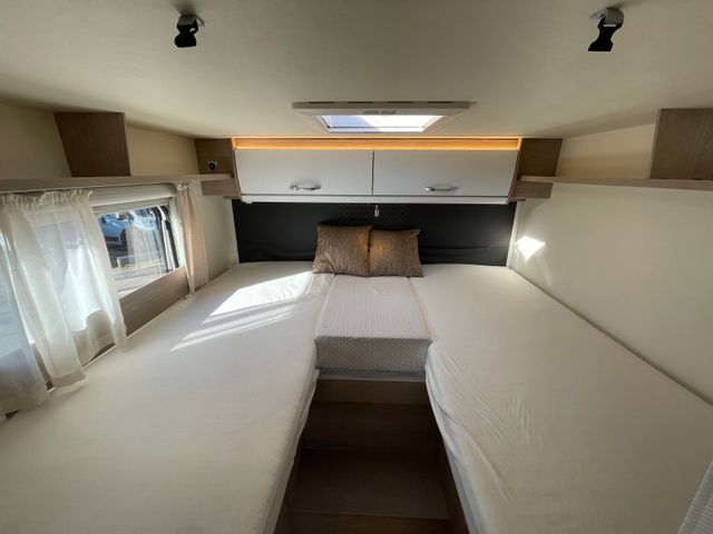 Das Bürstner-typische Wohnfühl-Gefühl unterwegs wird durch den Einzelbett-Grundriss mit gut zugänglicher Heckgarage und einem modernen SkyLine Innenraumdesign garantiert. Die Einzelbetten können durch ein Schubelement und Zusatzpolster zu einem großen Doppelbett umgewandelt werden. Die strapazierfähigen Polster aus Vollleder mit SkyLine-Stick sowie die hellen Möbelfronten schaffen eine wohnliche, moderne Atmosphäre.