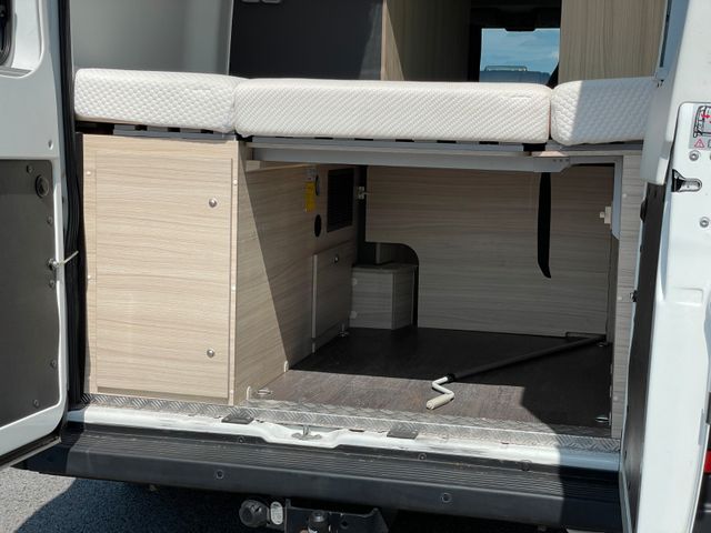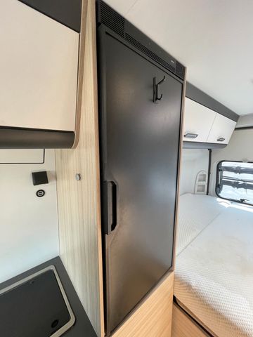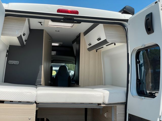 Außenfarbe: Polar Weiß, Serienpolster: Ross, Serienausstattung Chassis „Dülmener Edition“, Serienausstattung Wohnraum & Technik, Solar, Markise, Anhängerkupplung (starr), Fahrradträger, Radio mit Rückfahrkamera, Doppelbett im Heck, 4 Sitzplätze