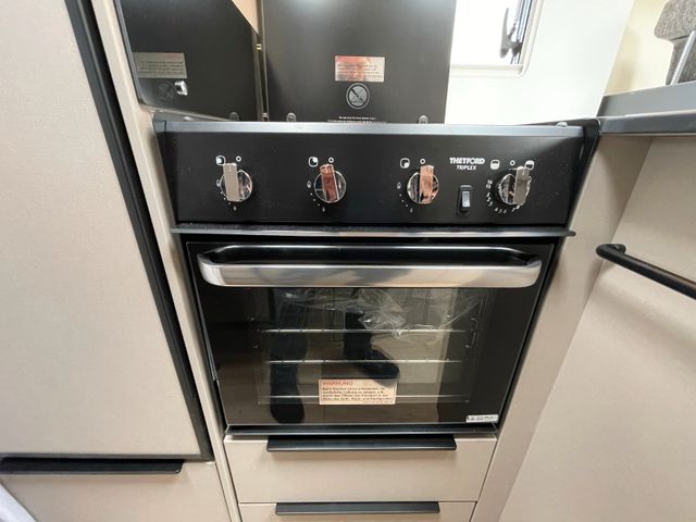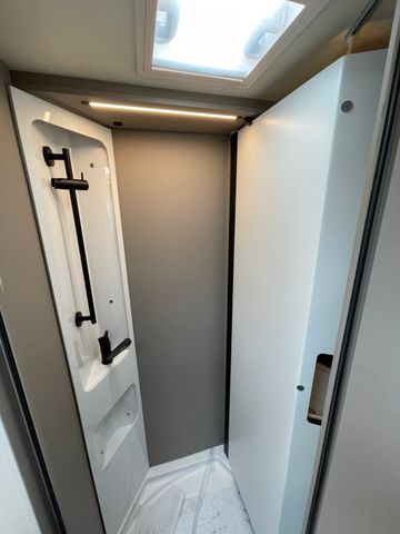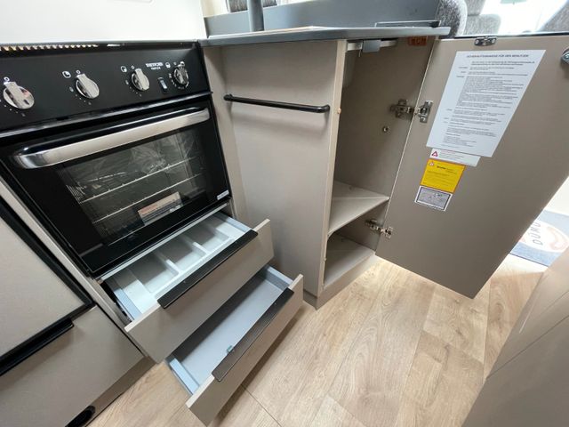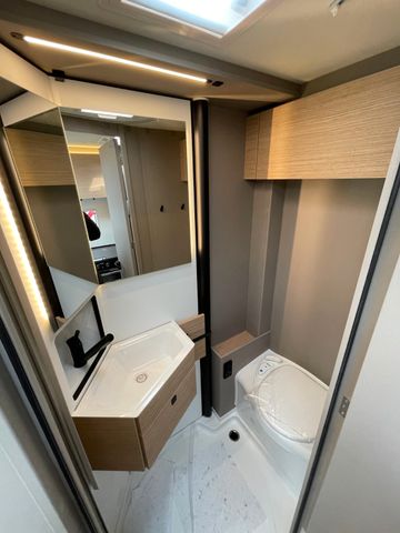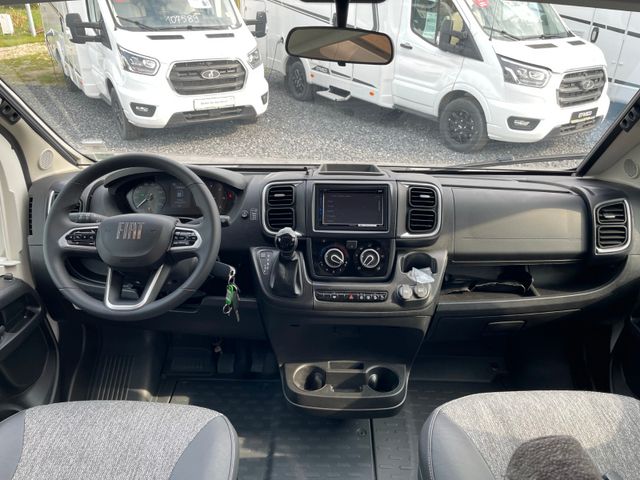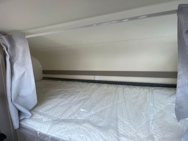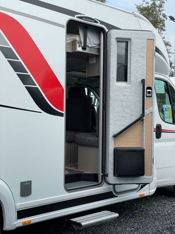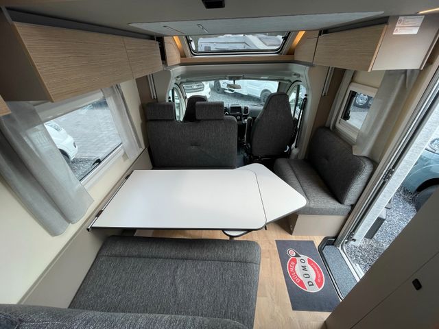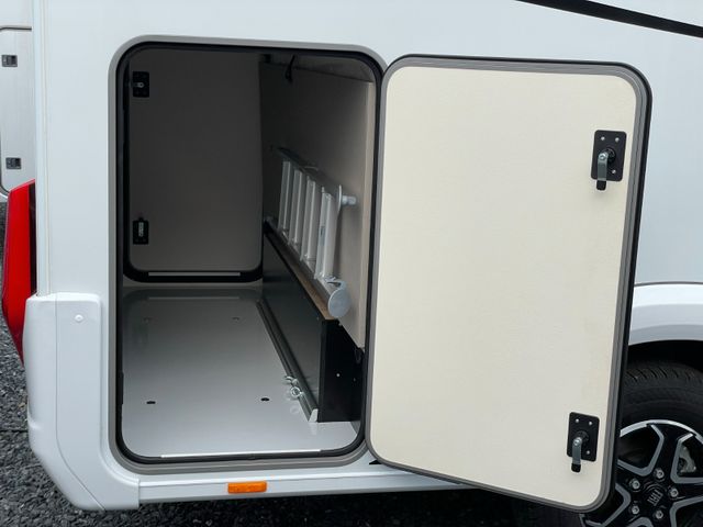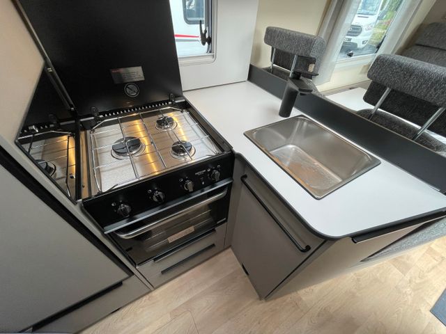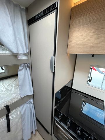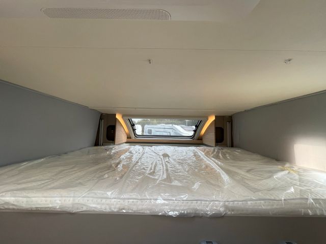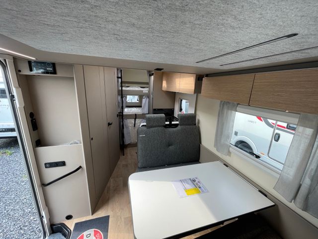 Modelljahr 2025, Polster: Faro, Möbeldekor: Avana Slate, Version mit Hubbett, Etagenbett, & 6. Sitzplatz gegen Fahrtrichtung, Herd-Backofen-Kombination, Außendusche, Solaranlage Teleco 1 x 100 W mit Regler, Isofix-Kindersitzsicherung für zwei Sitze, Dieseltank 90 Liter