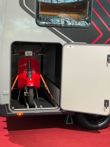 GFK-Dach, GFK-Seitenwand, GFK-Vollform-Heckwand (40 / 30 / 30 mm), Aufbautür mit Einstiegshilfe, Kleiderhaken, integriertem Abfallbehälter, Elektrisch ausfahrbare Einstiegsstufe, Garagenklappe rechts, Verzurrsystem Heckgarage, Coupe-Einstieg, Dachhauben 40×40 cm in Schlaf-, Küchen-, Wohn- und Badbereich, Ausstellfenster, doppelt verglast, getönt inkl. Kombirollos, Türschweller, Trittstufen mit Stauraumfunktion, Stauraum für Gasflaschen: 2×11 kg
