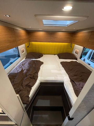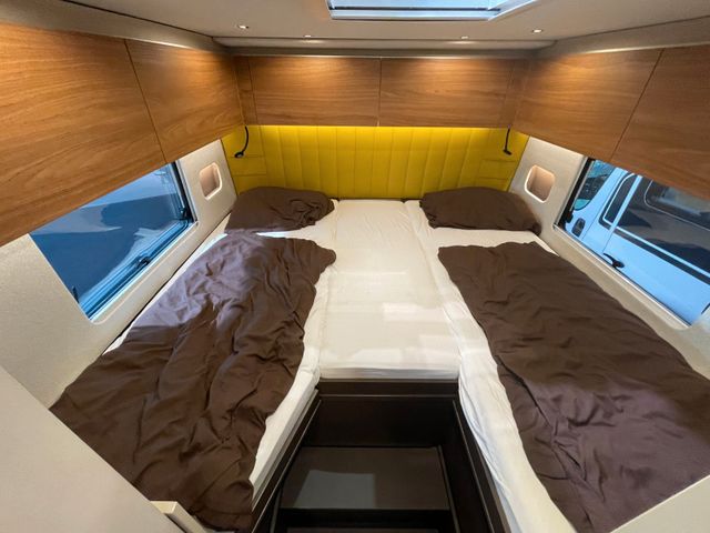 2x Einzelbetten längs, Couch-Couch Sitzgruppe, Freistehender Tisch mit starrem Fuß, Kaltschaum-Matratzen, Stufenfreier Durchgang Fahrerhaus–Wohnraum