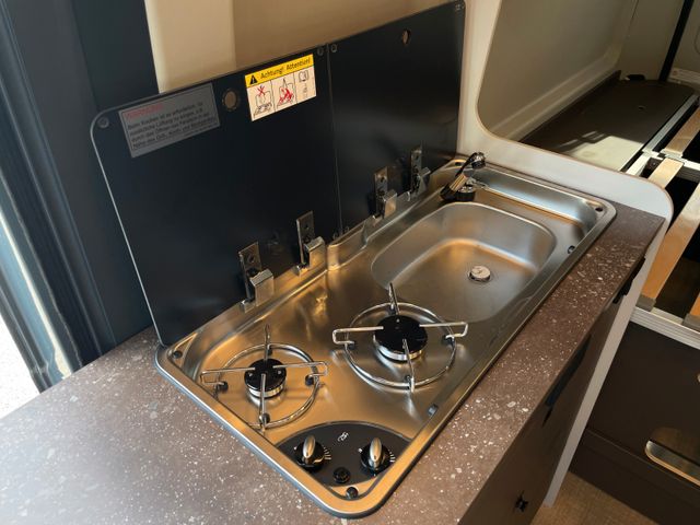 2-Flammen-Kocher mit integrierter Spüle und Glasabdeckung
