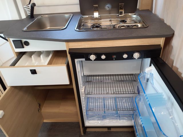 Tempomat + Geschwindigkeitsbegrenzer, Trennvorhänge Fahrerhaus/Innenraum, USB-Anschluss/USB-C, Vorbereitung Solarpanel, Vorverkabelung Rückfahrkamera, Stahlfelgen mit Radkappen 16" grau, Thermo-Innenrollos im Fahrerhaus, Kleiderschrank∗