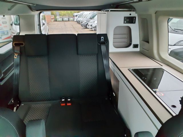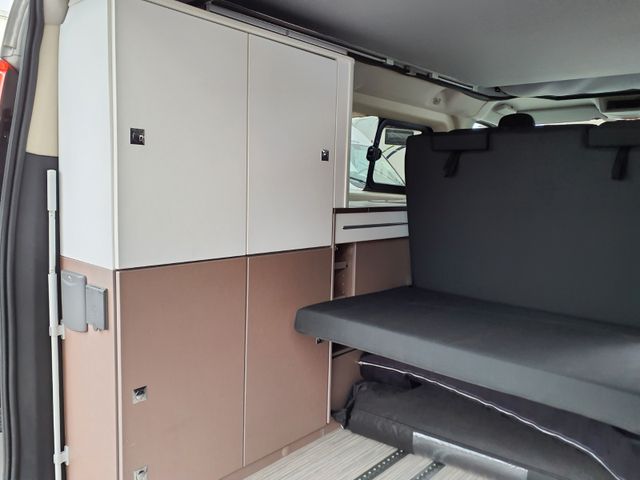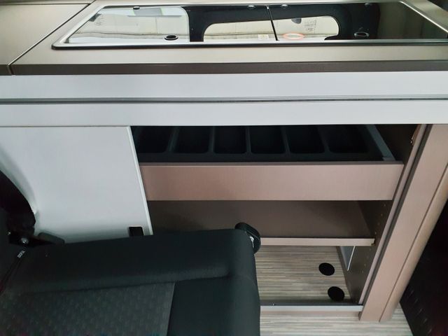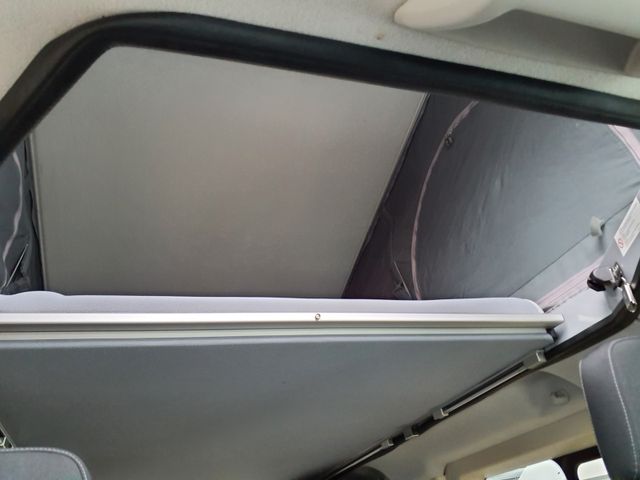 Verdunkelung Wohnraum und Fahrerhaus, 3. und 4. Sitzplatz auf Sitzbank inkl. Isofix und Schlaffunktion, Zusatzpolster für Liegewiese, Staufach unter dem Bank, Kompressor Kühlbox 41 L