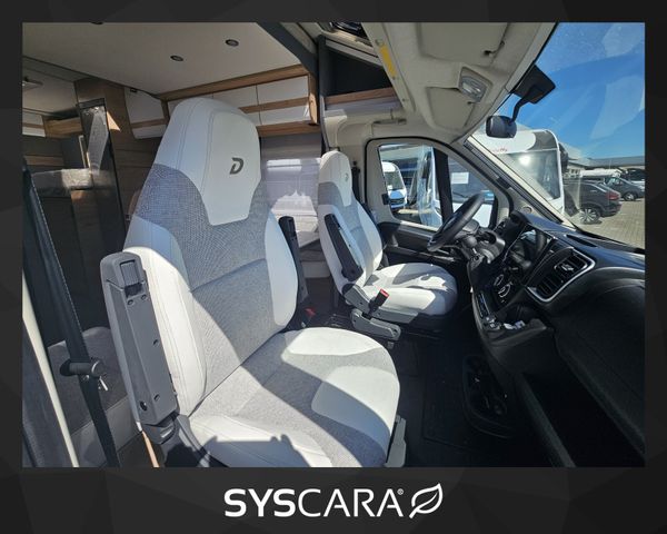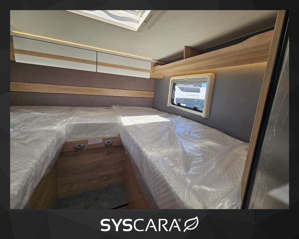 Modell 2025, Motor / Chassis: Fiat Ducato 2,2 Liter Multijet, Leistung: 103 kW / 140 PS, Getriebe: Schaltgetriebe, zul. Gesamtgewicht: 3500 kg, Bett(en): Hubbett, Einzelbetten, Sitzgruppe: L-sitzgruppe, Polster: Heron, Holzdekor: Noce Nagano