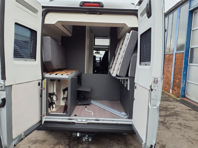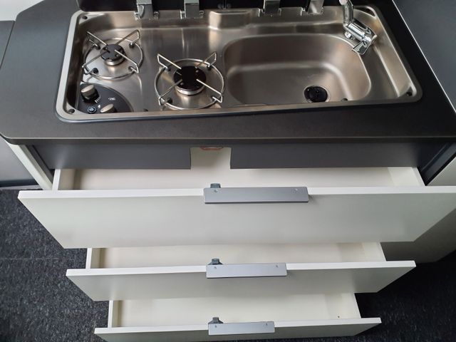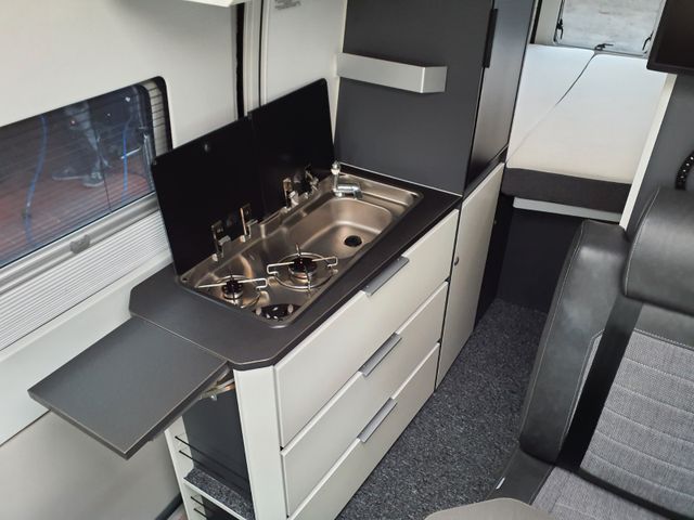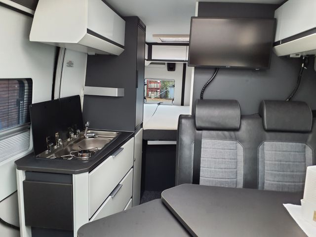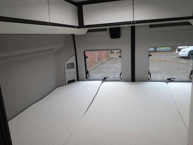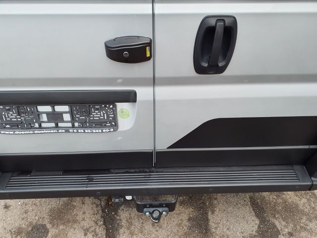 Kit de Luxe: Nebelscheinwerfer, Rückfahrwarner, Lenkrad und Schaltknauf in Teilleder, Kühlergrill und Scheinwerferrahmen scharz, Fahrerhaus- und Wohnraumscheiben getönt, Fenster inkl. Kombirollo in Hecktüren, Falt-Verdunkelung Faherhaus und Wohnraum-Seitenfenster, Fliegenschutz an Schiebetür, Einstiegsstufe elektrisch, Einstiegsbeleuchtung, Lade-Booster, Mono Control CS, Gasfilter, Abwassertank isoliert und beheizbar, Abdeckung Kocher und Spüle.