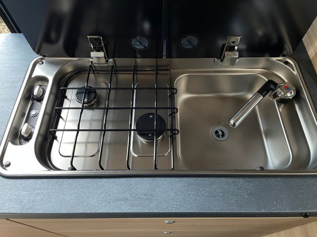 Praktisches und großes Raumbad, Großzügiges und offenes Raumkonzept, Kühlschrank mit herausnehmbarem Frosterfach und in beide Richtungen zu öffnen, Sitzbank aus ergonomischem Formpolster