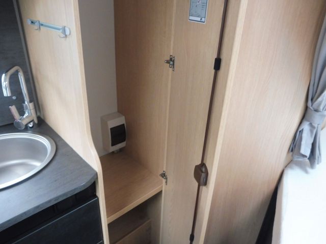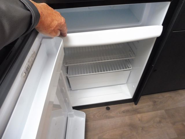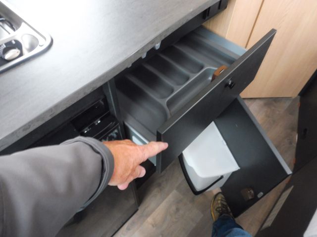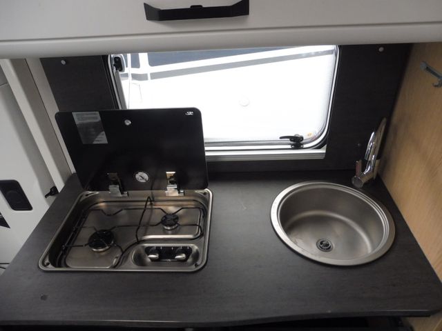im Küchenblock, Großes Rundspülbecken aus Edelstahl, Wassertank inkl. Boiler 122 l, Abwassertank 92 l, Abfalleimer, LED-Band, Kühlschrank 78 l mit Gefrierfach 11 l