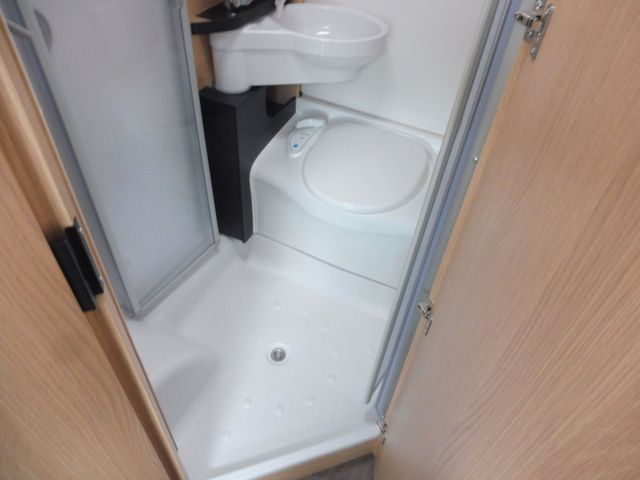 Bad mit Banktoilette und integriertem Duschraum, Cassettentoilette mit elektrischer Pumpe und