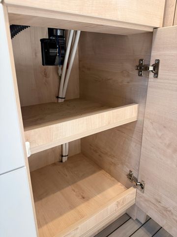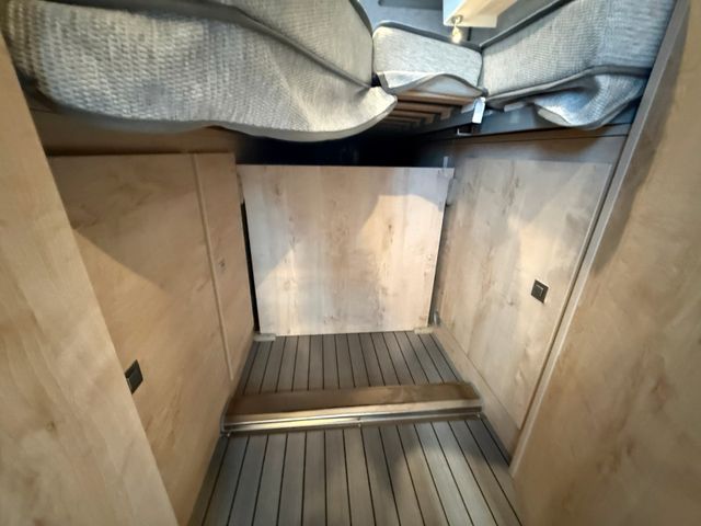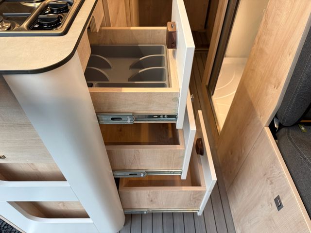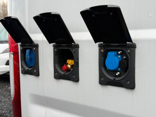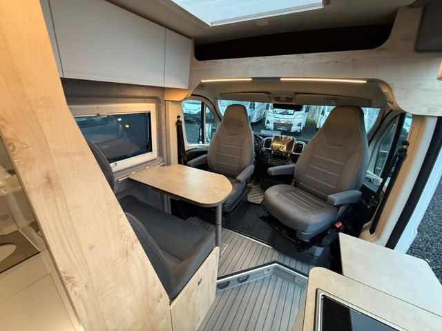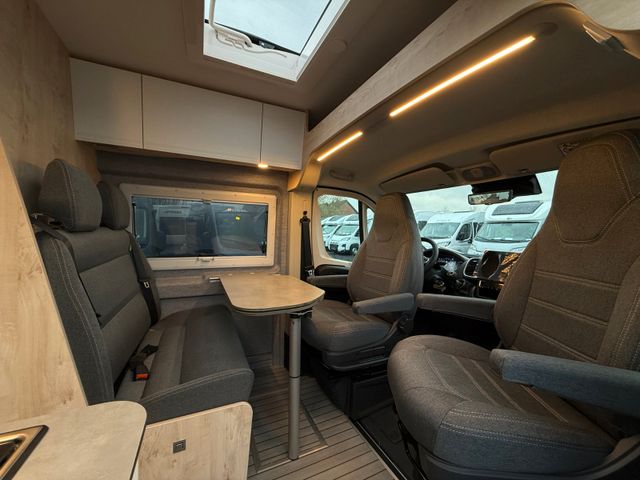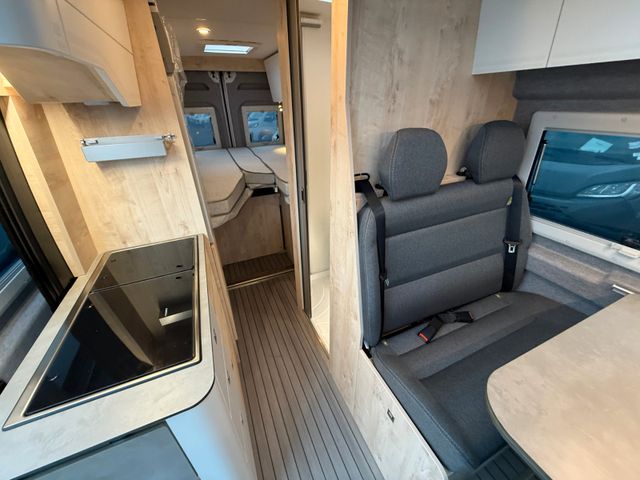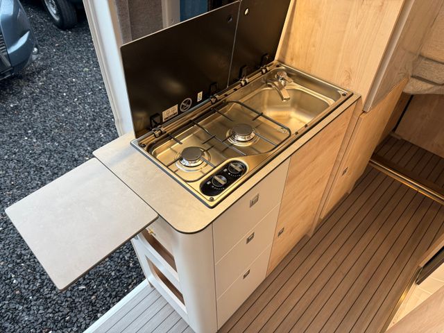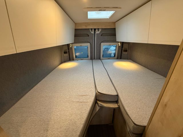 Full-Package Komplettausstattung*, *Notbremsassistent (Autonomous Emergency Braking), Aufmerksamkeitsassistent, Seitenwindassistent, Toter-Winkel-Assistent & hintere Querverkehrserkennung, Nebelscheinwerfer, Spurhalteassistent, Regen- und Lichtsensor, Traction+, Verkehrsschilderkennung, Lackierte Stoßfänger vorne + schwarze Skid-Plate, Außenspiegel elektrisch verstellbar, beheizbar und anklappbar, 10″ Infotainment-Touchscreen mit DAB, Bluetooth, Navigation, Induktive Ladestation für Mobiltelefon, Digitales Cockpit & digitaler Rückspiegel, Rückfahrkamera & 360° Parksensoren, Adaptive Geschwindigkeitsregelanlage (ACC) & intelligenter Geschwindigkeitsassistent, Außenfarbe: Eis-Weiß, Innenausstattung: Holzdekor Ahorn, Sitzbezug Serie, Dachhaube, Bad 28x28 cm, Betten hinten hoch, Isofixvorrichtung an Standardsitzbank rechts + links, Schublade unter Sitzbank, Steckdosensatz außen (TV, Gas, 220V), Zuziehhilfe Schiebetür