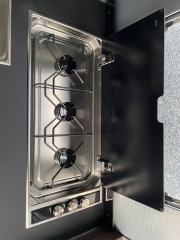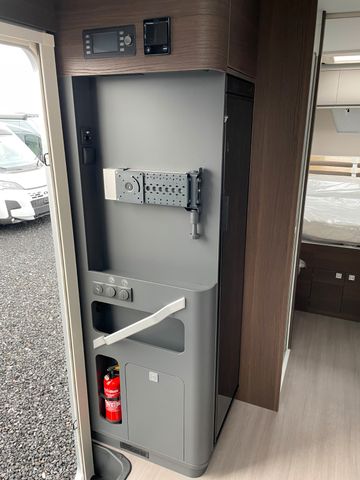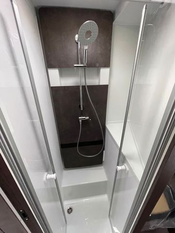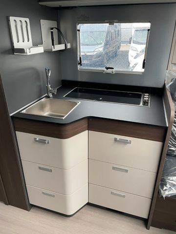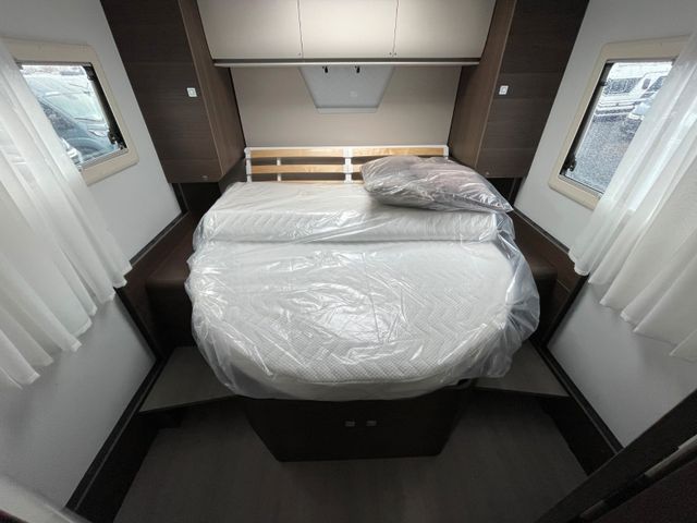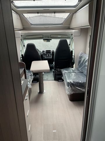 Basisfahrzeug Fiat Ducato 8, Euro 6d_ISC-FCM Abgastechnik mit Adblue und Start/Stopp-System, Fahrer- und Beifahrer-Airbag, ESP, ABS, ASR, LAC, HBA, MSR, Traction +, Tagfahrlicht, Reifendruck-Kontrollsystem, Multifunktionslenkrad, Nebelscheinwerfer, 16''-Leichtmetallräder, Komfort-Faherhaussitze höhen- und neigungsverstellbar mit Armlehnen und Sockelverkleidungen, Lenkrad und Schaltknauf in Teilleder, Klimaanlage Fahrerhaus, Tempomat, Radiovorbereitung DAB, Außenspiegel elektrisch verstell- und beheizbar, Fensterheber Fahrerhaus elektrisch, Funk-Zentralverriegelung, Falt-Verdunkelung Fahrerhaus, Zentralverriegelung, Fenster, Abfalleimer und Fliegenschutz an Wohnraumtür, Panorama-Dachfenster Front, Lade-Booster, Gassicherheitsventil Mono Control CS mit Gasfilter, LED-Ambientebeleuchtung, dimmbar, Abwassertank isoliert und beheizbar, TV-Halterung, Kurbelstützen hinten, Rückfahrwarner, Kühlergrill schwarz, Alde Warmwasser-Fußbodenheizung, Heckgarage mit Stoffauskleidung und Einhandbedienung für die Klappen, LED-Ambientebeleuchtung