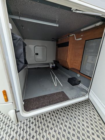 Heckleuchtenträger links unten und links oben angerissen, Schramme neben Aufbautür, kleines Loch in der Tischplatte, Duschtasse wurde nachträglich versiegelt, Markisengehäuse links leicht beschädigt